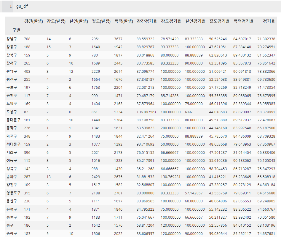 gu_df[ gu_df[['강간검거율', '강도검거율', '살인검거율', '절도검거율', '폭력검거율']] > 100 ] = 100