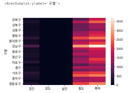 sns.heatmap(gu_df[['강간', '강도', '살인', '절도', '폭력']])