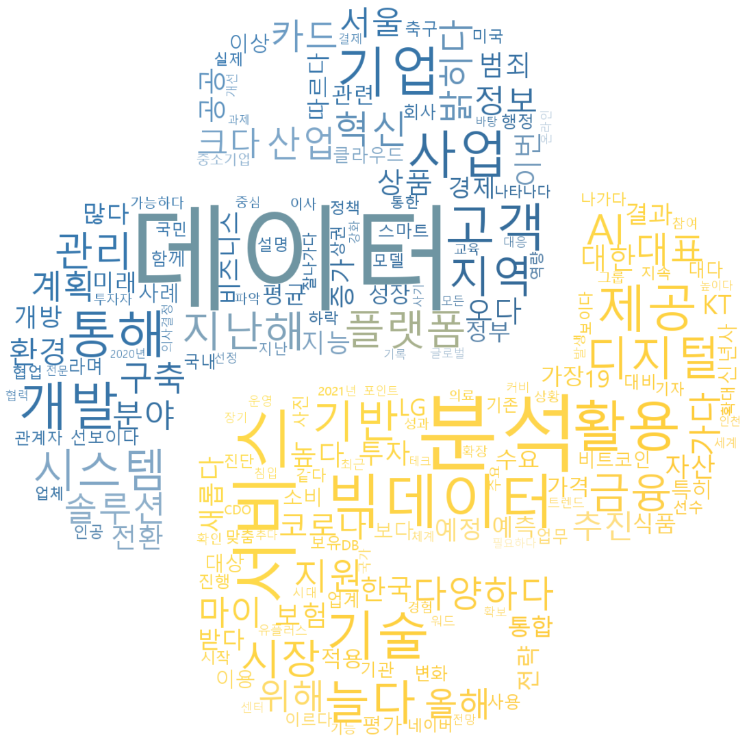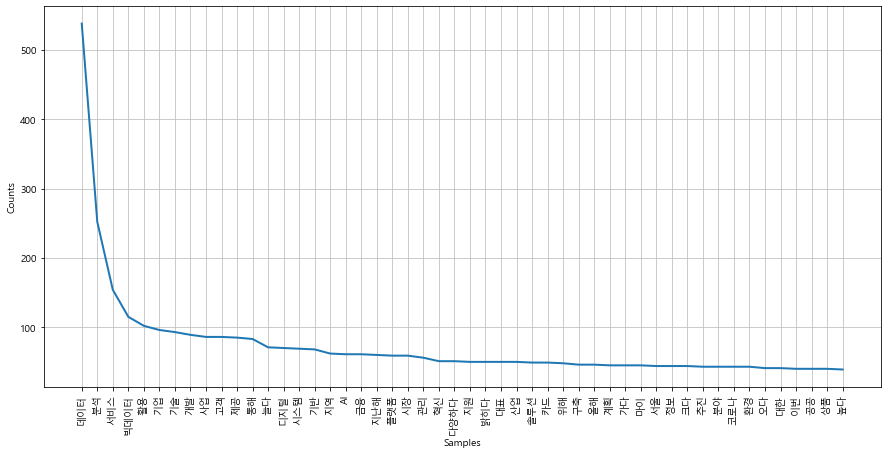 # >FreqDist({'데이터': 538, '분석': 252, '서비스': 154, '빅데이터': 115, ...})