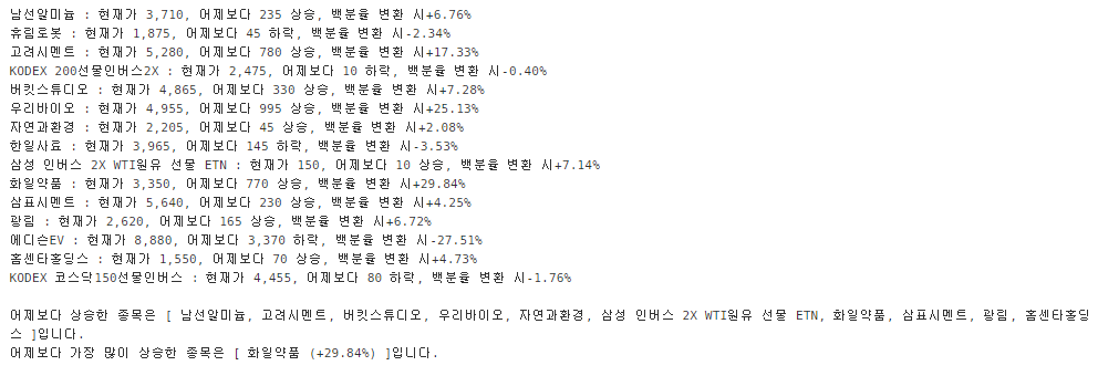 print('\n어제보다 상승한 종목은 [ {} ]입니다.'.format(plus_items))