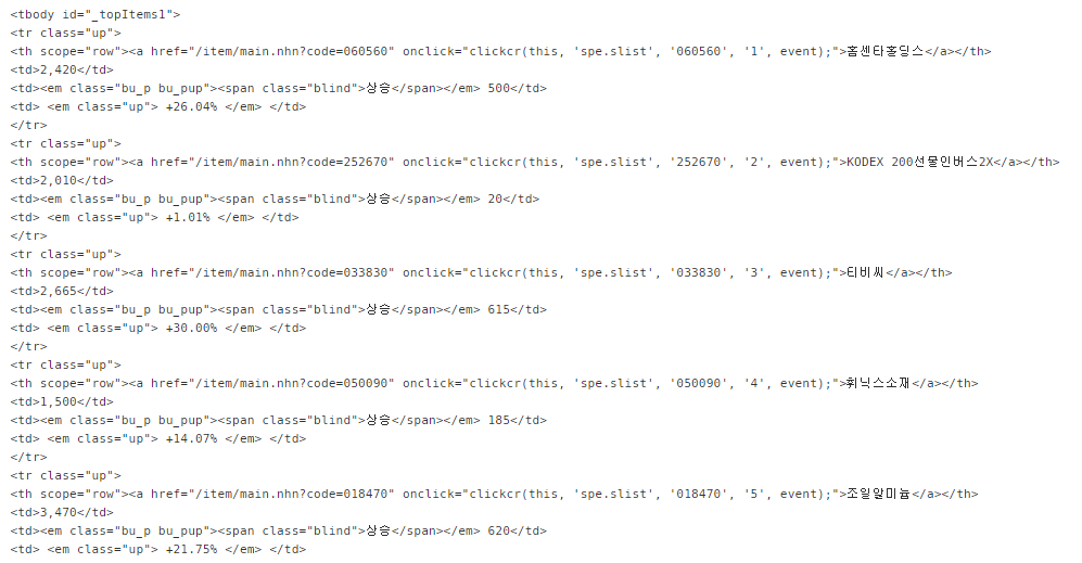 highest_item = {'top_name':'', 'percent_change':0} # 백분율 변화량이 + 부호인 종목 중 가장 큰 비율로 증가한 종목을 담을 dict