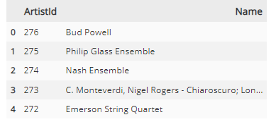 ArtistId DESC; -- 새로 넣어준 Artist가 가장 마지막에 위치 -> 내림차순으로 정렬해 확인