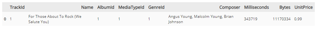 # >(1, 'For Those About To Rock (We Salute You)', 1, 1, 1, 'Angus Young, Malcolm Young, Brian Johnson', 343719, 11170334, 0.99)