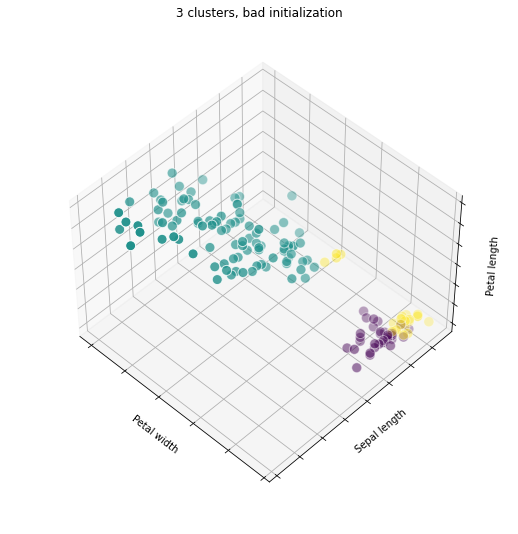 titles = ['8 clusters', '3 clusters', '3 clusters, bad initialization']
