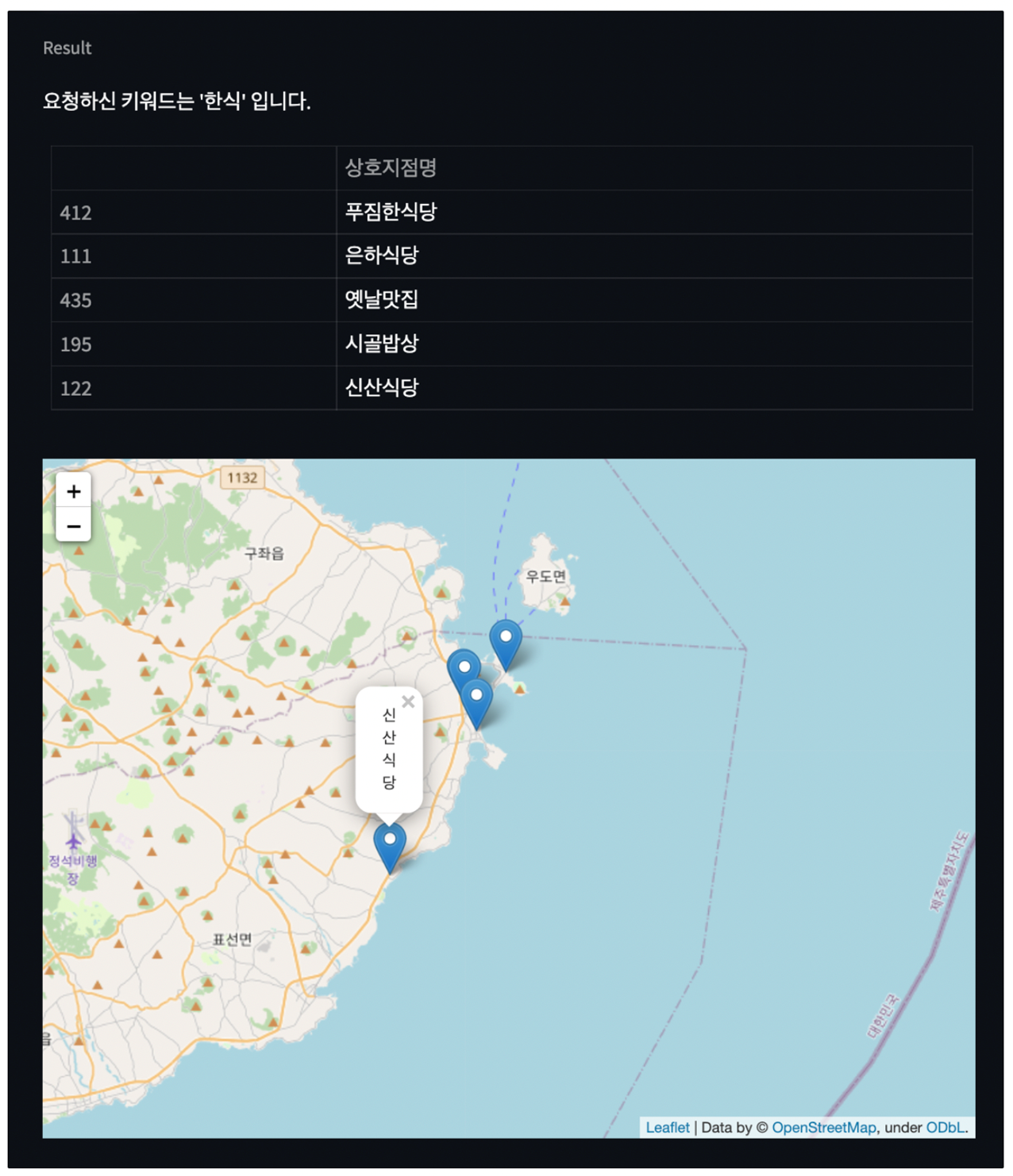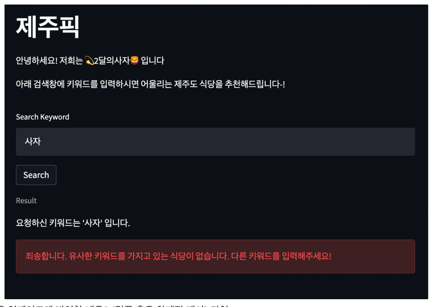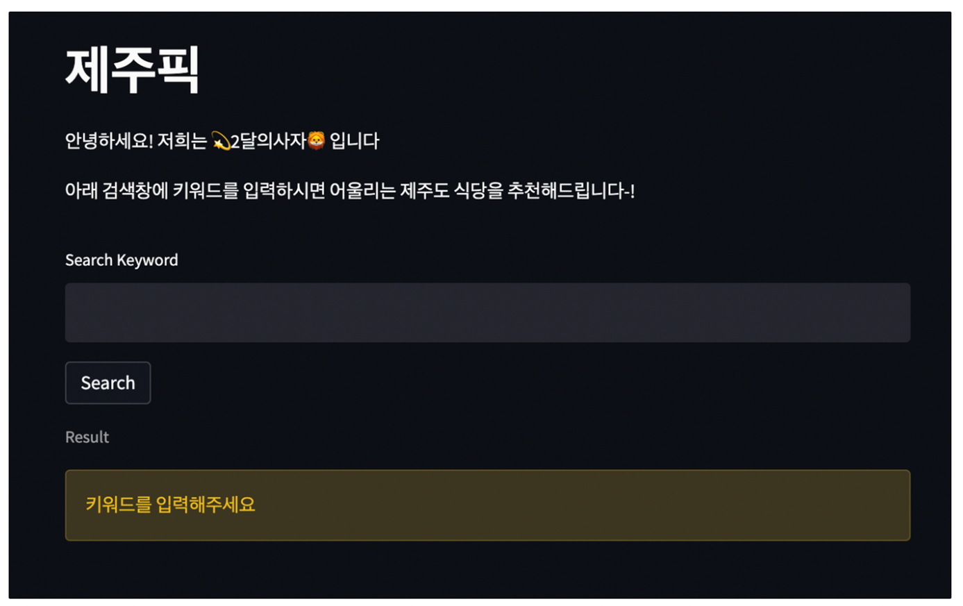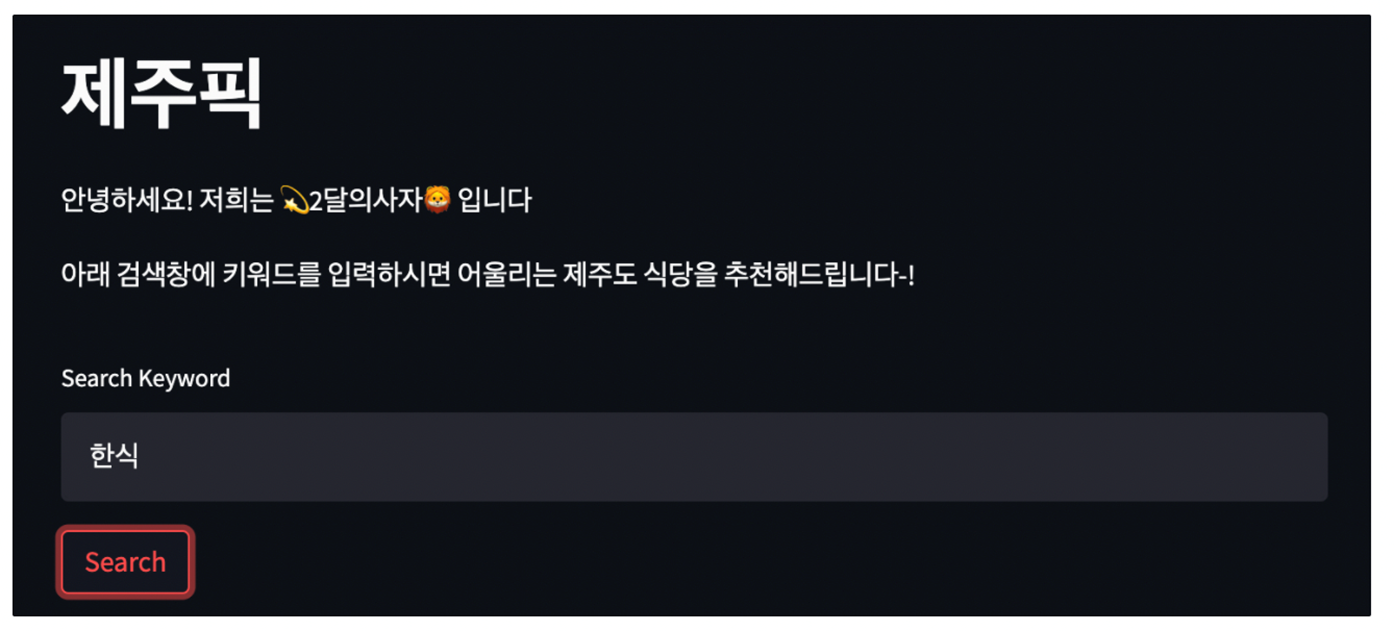 st.write("아래 검색창에 키워드를 입력하시면 어울리는 제주도 식당을 추천해드립니다-!")